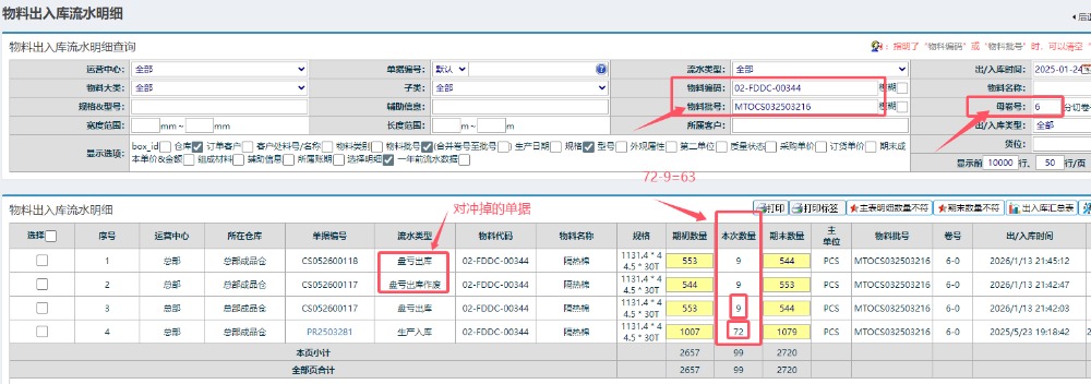 :點晴模切ERP利用出入庫流水數(shù)據(jù)分析庫存是否正確![]() 經(jīng)常有客戶提出問題,說系統(tǒng)庫存表的庫存與實物不符。如果遇到這種情況,可以利用出入庫流水數(shù)據(jù)分析庫存是否正確。 以料號:02-FDDC-00336這個物料為例:批號MTOCS032503216,卷號6,當前數(shù)量63