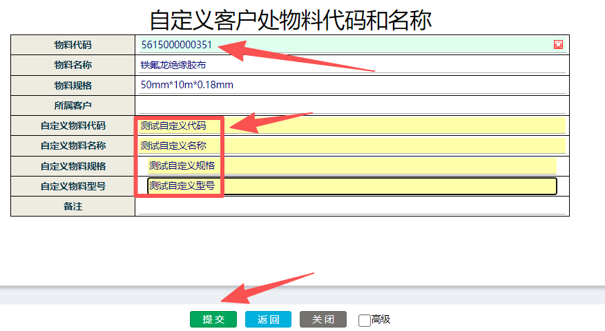 進入界面,點擊選擇需要自定義的原始料號,錄入自定義料號,自定義名稱,自定義規(guī)格,自定義型號提交完成