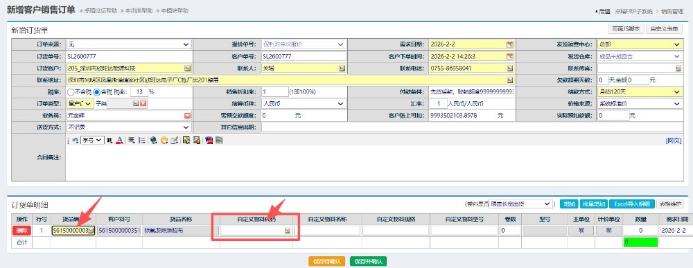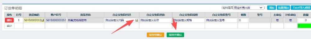 進入界面后,選擇客戶,選擇內部料號,再點擊選擇自定義物料,填寫好對應數量與單價提交完成,如下圖所示: