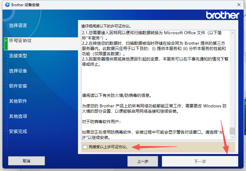 2、勾選上“我接受以上許可證協(xié)議”,接著點“下一步”。