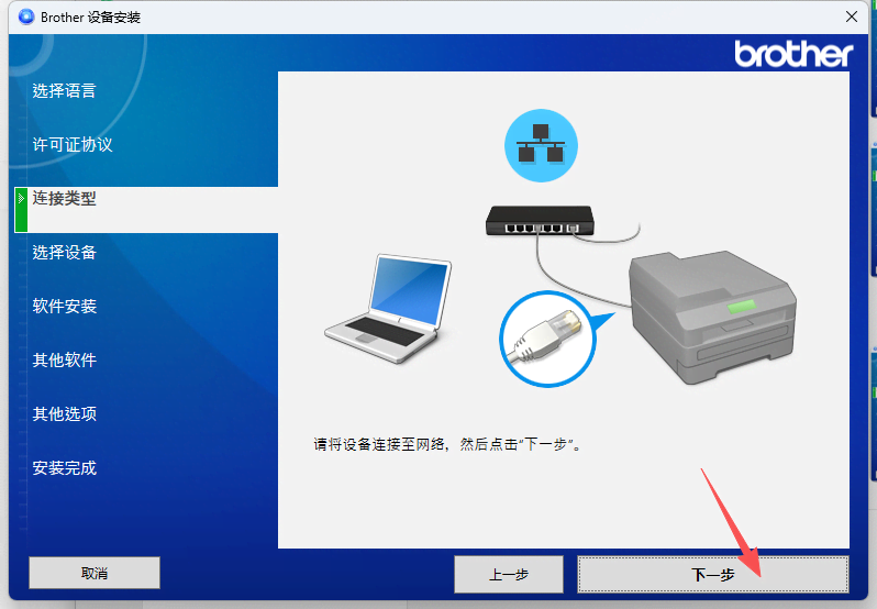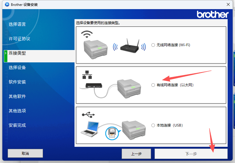 3、接著選擇好對應的連接類型(WIFI、有線網(wǎng)絡(luò)、USB連接),點擊“下一步”