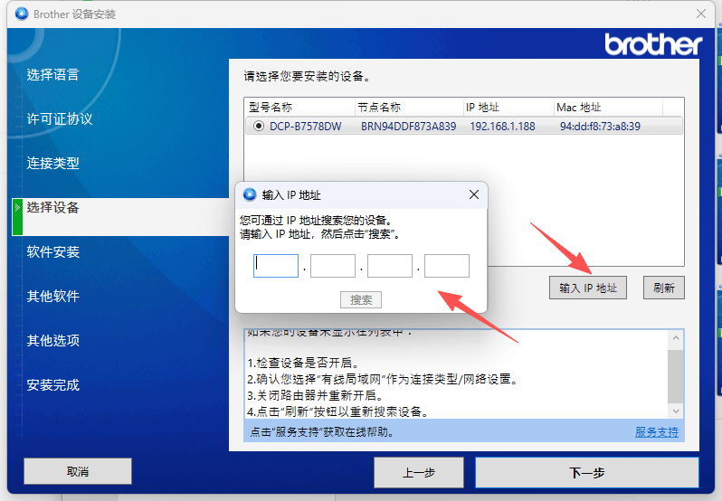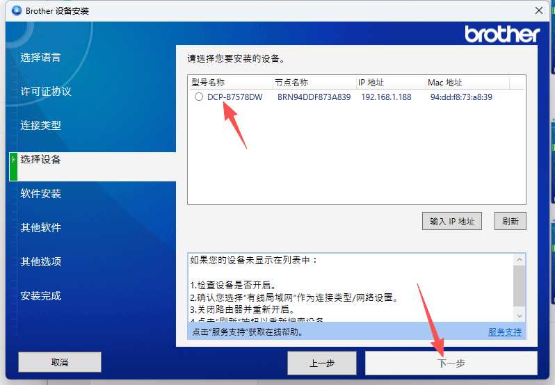 5、接著選擇要安裝的打印機設(shè)備,點擊選擇設(shè)備,然后點擊下一步。 注:如果您的設(shè)備未顯示在列表中: 1.檢查設(shè)備是否開啟。 2.確認您選擇“有線局域網(wǎng)”作為連接類型/網(wǎng)絡(luò)設(shè)置。 3.關(guān)閉路由器并重新開啟。 4.點擊“刷新”按鈕以重新搜索設(shè)備。