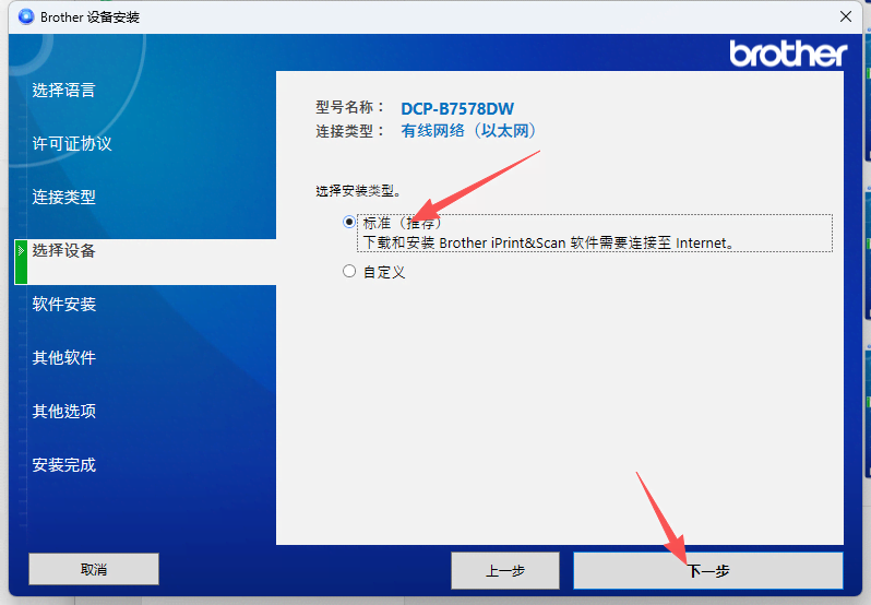 6、點擊選擇確認好打印機型號后,選擇安裝類型,默認選擇“標準”即可,點擊“下一步” ![]()