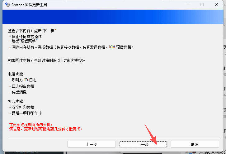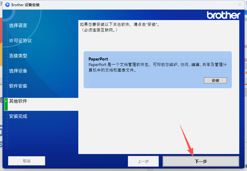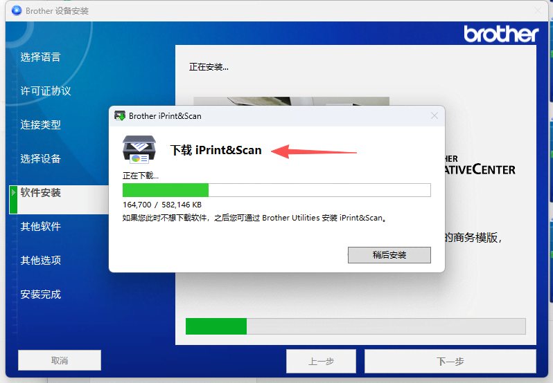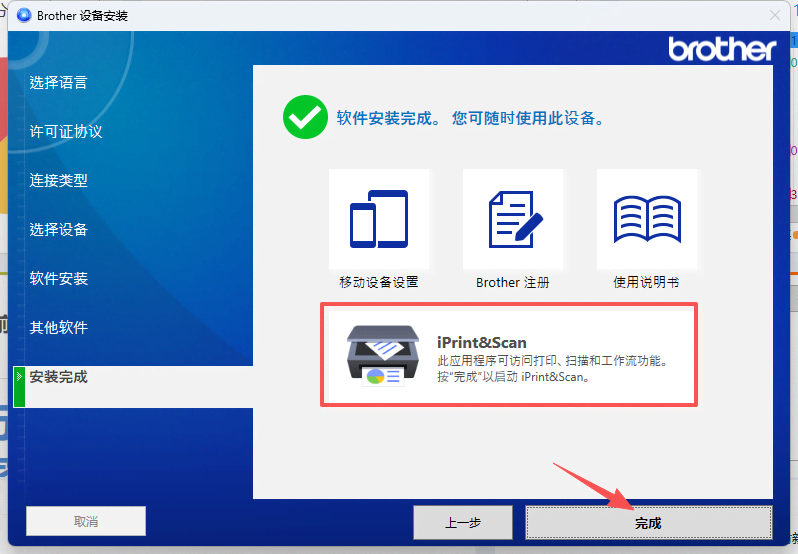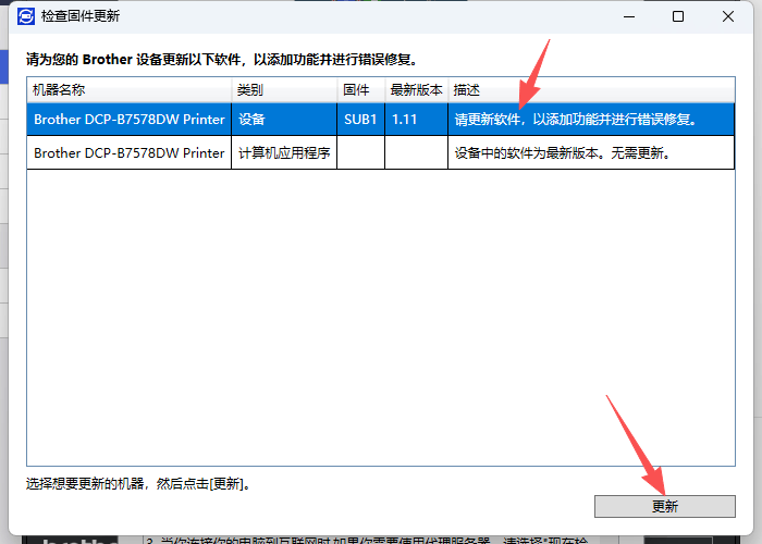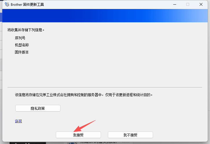 1、點擊打開“Brother iPrint&Scan”,會出現(xiàn)彈窗需要更新“設(shè)備”和“計算機應用程序”,按照步驟操作點擊更新。 點擊“我接受”》“下一步”