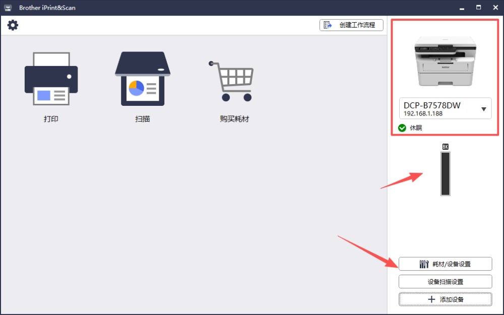 4、完成設(shè)備綁定之后,可以在右邊的界面直觀地看到打印機設(shè)備情況以及耗材情況,以及掃描的設(shè)置。