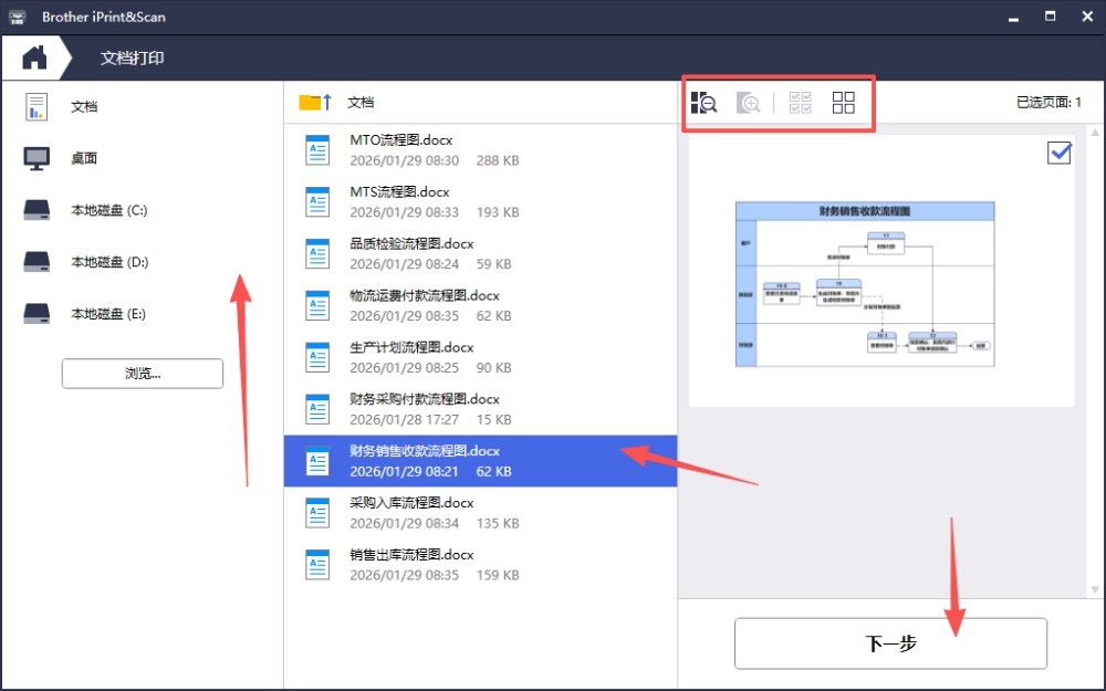 2、選好文件類型后,在電腦目錄路徑中查找對應的文檔文件或者圖片,點擊選擇后同時在上方選好頁面,點擊“下一步” 3、設(shè)置好對應的打印份數(shù)、紙張大小、布局以及是否需要雙面打印,點擊打印