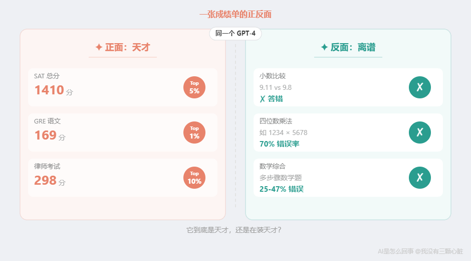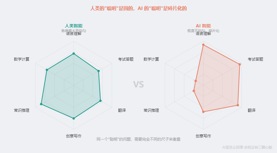 三年后,矛盾不但沒消失,反而升級了——連研究 AI 的人自己也在為同一個問題爭論不休:這些模型到底是真的在"推理",還是學會了更高級的"模式匹配"? 如果你覺得這個問題比三年前更難回答,恭喜——你看到了 2026 年 AI 領域最核心的困惑。 你用錯了尺子這個問題之所以難回答,不是因為你對 AI 了解不夠,而是因為「聰明還是不聰明」這個問題本身就是錯的。 為什么你會覺得這組數據矛盾? 因為你在不自覺地做一個假設:「聰明」是一個統一的整體。 對人類來說,這個假設基本成立。一個能通過律師考試的人,不會連 9.11 和 9.8 都比不清楚。一個 GRE 語文 99 百分位的人,小學數學不會錯。人類的各種認知能力之間有很強的關聯性——語言能力強的人,邏輯能力通常也不差。心理學上叫這個"g 因子"——一種貫穿所有認知任務的一般智力因素。 但 AI 不是這樣。 AI 的"聰明"是碎片化的。 它在不同任務上的能力可以相差幾個數量級——律師考試前 10%,同時連小數比大小都會搞錯。這兩件事在 AI 身上同時成立,沒有任何矛盾。 為什么?因為 AI 的每一項能力,都是從那個特定領域的訓練數據中學來的。律師考試的能力來自海量法律文本中的問答模式。小數比較的"能力"來自——這個我們下面說。 用「聰明不聰明」來評價 AI,就像用「高不高」來描述一條河。 一條河有的地方深不見底,有的地方你能蹚過去。說它"深"或"淺"都不對——你得說"在哪個位置有多深"。 AI 也一樣。你不能問"AI 聰明嗎"。你得問"AI 在這個具體任務上有多強"。 2026 年的數據讓這個特征更加鮮明——像一個數學競賽滿分、但換個數字就做錯的學生。不是偶爾失誤,而是結構性地:某些維度強到超越人類專家,某些維度弱到讓人匪夷所思。
