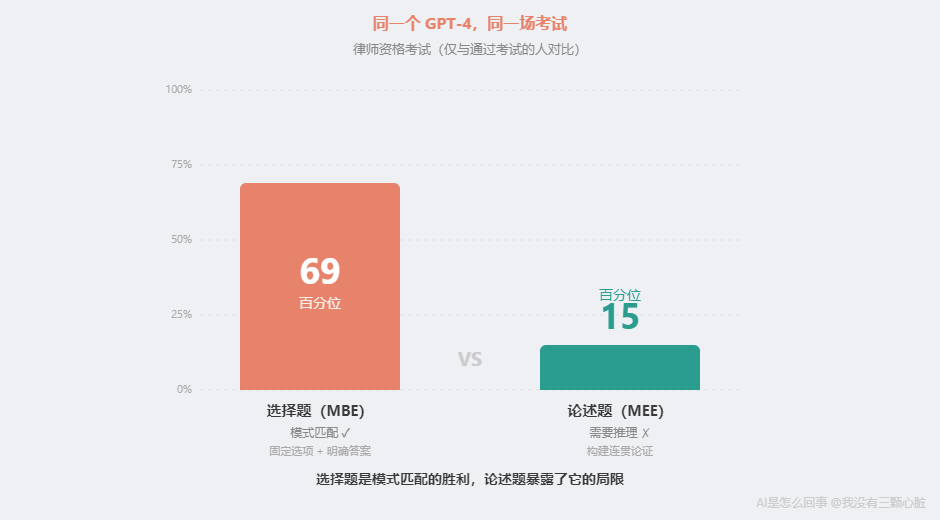 當 GPT-4 在考試中看到類似問題時,它做的和訓練時一模一樣:根據題目中的文字模式,預測最可能的答案。 這不是"懂法律",是"見過太多法律題了"。 打個比方:讓一個人做 10 萬道律師模擬題,每道都告訴他正確答案,但從來不講為什么。10 萬道之后,他大概率也能通過考試——不是因為"理解"了法律,而是見過了足夠多的模式。 但有個數據很能說明問題。MIT 博士生 Eric Martinez 在 2024 年發表的重新評估研究中發現:GPT-4 在選擇題上大約排在全體考生的第 69 百分位,但如果只看論述題、只和通過考試的考生比,它只排在約第 15 百分位——85% 的通過考試的人比它寫得好。 為什么選擇題強、論述題弱?因為選擇題是典型的模式匹配——有固定選項、有明確答案、訓練數據中有大量類似問答對。論述題需要構建連貫的法律論證——理解概念之間的因果關系,不能只識別模式。 選擇題是模式匹配的勝利。論述題暴露了模式匹配的局限。