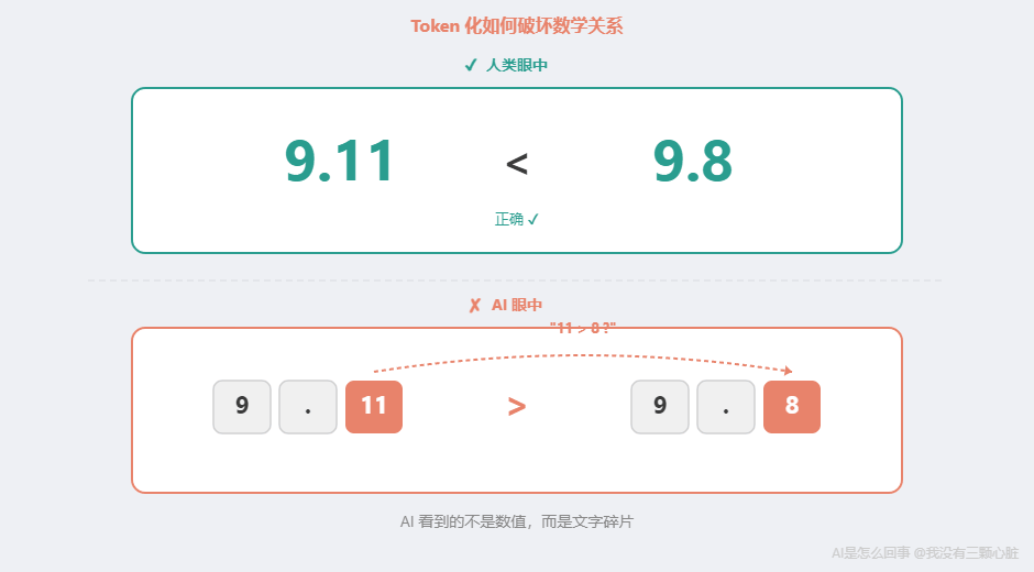 不過,這個結論也招致了爭議。研究者 Alex Lawsen 指出,部分發現可能源于實驗設計的限制(比如輸出長度被截斷)。后續論文 "Rethinking the Illusion of Thinking" 得出了更細致的結論:并非全部可以歸結為實驗缺陷,AI 推理確實存在認知局限——但局限的程度還在爭論中。 換句話說——連研究者自己也沒有達成共識。 這是 2026 年 AI 領域最大的未解之謎之一。 手術二:為什么算不對 9.11 > 9.8?這個錯誤看起來離譜,但用第一章的知識可以精確解釋。這里面有兩層原因。 第一層:它根本不是在"計算"。 當你讓 ChatGPT 比較 9.11 和 9.8 的大小時,它沒有一個"數學模塊"在工作。它做的仍然是那一件事:預測下一個最可能的詞。 它看到"9.11 和 9.8 哪個大"這段文字,然后在訓練數據中尋找類似模式。簡單算術("2+3=5")在訓練數據中出現了無數次,模式已經被記住。但"比較兩個小數"這種任務,在訓練數據中的覆蓋遠不如考試題那么充分。 第二層:Token 化把數字的數學關系破壞了。 還記得第 2 篇講的 Token 化嗎?AI 處理文字的第一步是把文字切成小塊。 Token 化可能會讓數字的數學關系被破壞——數字被拆成單獨的字符或片段后,AI 看到的不再是一個完整的數值,而是幾個獨立的文本碎片。比如"9.11"和"9.8"被拆開后,AI 可能更關注碎片之間的文字模式("11 大于 8"),而非小數本身的數學含義——于是它預測"9.11 更大"。 數字之間的數學關系(大小、相鄰、倍數)在 Token 化過程中被破壞了。 在 AI 眼中,9.11 和 9.8 不是兩個可以比較的數值——它們是幾個沒有數學含義的文字碎片。 到了 2026 年,這類基礎算術錯誤已經大幅減少,但沒有完全消失。根據 2026 年 2 月 ORCA 基準測試,即使最好的模型在 500 道實用數學題上也只能拿到 C 級成績。在所有錯誤中,計算錯誤占了 39.8%——不是不會推理,而是算不對。 但有一個關鍵發現:當 AI 可以調用外部計算器(比如 Python)時,準確率從約 70% 直接跳至接近 100%。 這說明問題不在"理解題意",而在"執行計算"——AI 能讀懂問題、列出步驟,但在具體算數的時候會出錯。就像一個數學老師能完美地講解解題思路,但自己心算乘法時會出差錯。 問題不在"推理",而在"執行"。