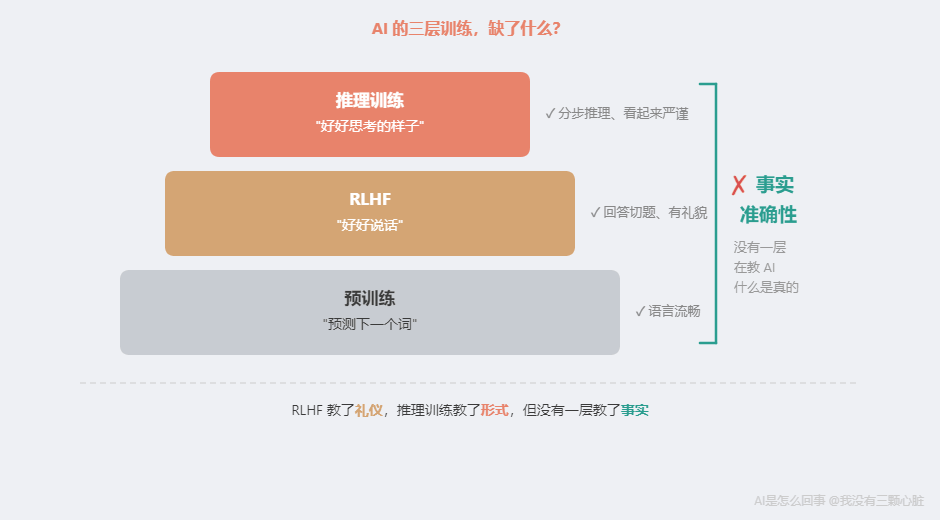 原因分析:為了"好好推理"而優化的模型,傾向于用看似合理的推測來填補知識空白——推理鏈越長,編造看起來越"有道理"。 RLHF 教會了 AI "好好說話"。推理訓練教會了 AI "好好思考的樣子"。但兩者都沒有教會 AI 什么是"事實"。