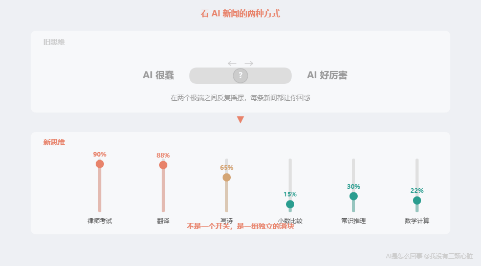 三個表現,三個原因,彼此之間完全獨立。 律師考試的能力不會幫助它比較小數。RLHF 的"禮儀訓練"不會讓它學會數學。每一項能力都是獨立習得的,取決于那個特定維度上的訓練數據和任務結構。 這就是為什么"AI 有多聰明"是一個錯誤的問題。 它暗示存在一個統一的"聰明度"可以衡量。但 AI 不是這樣——它是一個極其不均勻的能力拼圖,每一塊拼圖的大小取決于完全不同的因素。 正確的問題是:「AI 在這個具體任務上有多強?為什么?」 一把新尺子——連尺子本身也在被質疑如果你接受了這個認知轉換,你會發現看 AI 新聞的方式會發生質變。 以前: