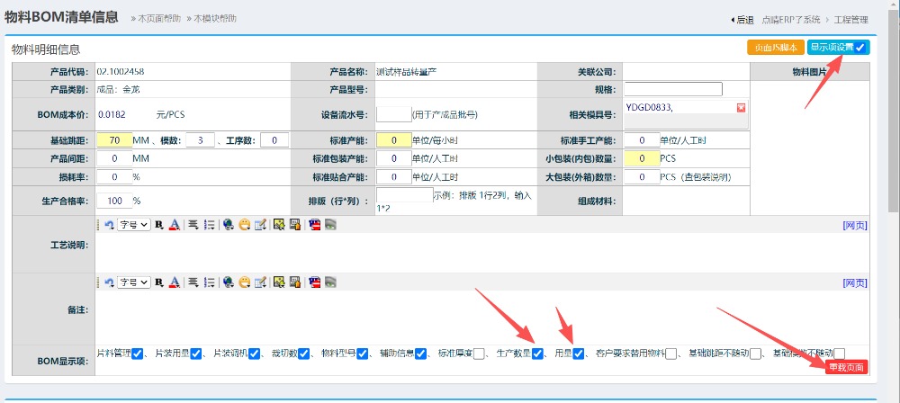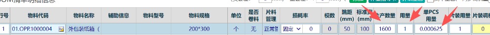 進入界面后,勾上表頭右上角的“顯示項設(shè)置”,將生產(chǎn)/用量按鈕勾上,點擊重新加載。 加載后,對應非卷料欄位填上數(shù)值即可,例如紙箱用量,1600個成品用一個紙箱,填寫內(nèi)容如下