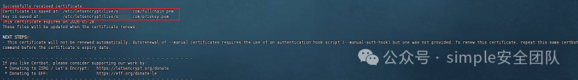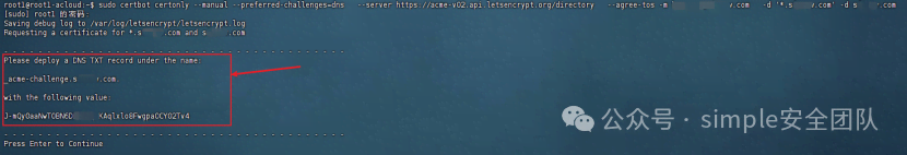 通配符證書必須通過DNS驗證方式申請,因為Let's Encrypt需要驗證您對域名的控制權。1、執行以下命令開始申請通配符證書,執行完之后不要點擊Enter鍵,要等確定TXT記錄生效之后才能點擊Enter鍵:sudo certbot certonly --manual --preferred-challenges=dns \ --server https://acme-v02.api.letsencrypt.org/directory \ --agree-tos -m your-email@example.com \ -d '*.simple.com' -d simple.com