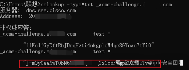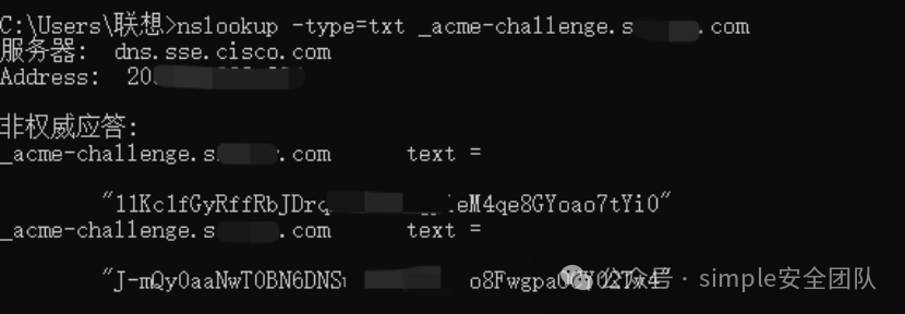 使用nslookupnslookup -type=txt _acme-challenge.simple.com