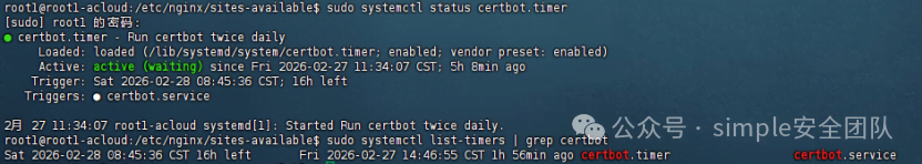 當命令返回的結果中包含您設置的兩條TXT記錄值時,說明DNS記錄已生效。此時返回Certbot交互窗口,按回車鍵繼續。7、DNS驗證通過后,Certbot將自動生成證書文件。成功后會顯示類似以下信息:1、Certbot默認會安裝自動續期服務,您可以通過以下命令驗證sudo systemctl status certbot.timer