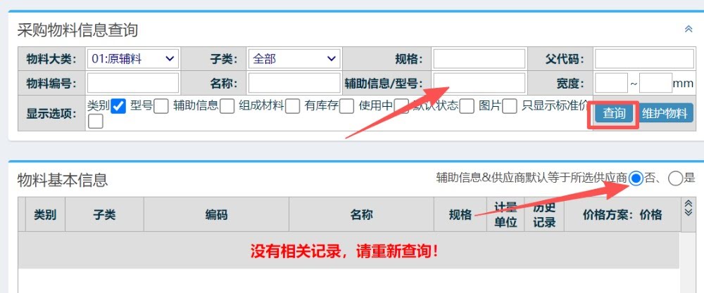 在操作采購下單時,會出現查詢不到任何物料情況,如下圖