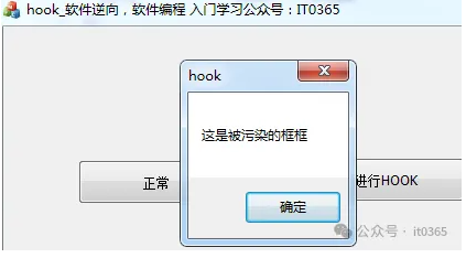 #include "..\\BoxedAppSDK\\include\\BoxedAppSDK.h" #pragma comment(lib, "..\\BoxedAppSDK\\lib\\bxsdk32.lib") 2.編寫HOOK按鈕代碼 2.1.獲取原API的地址 BoxedAppSDK_Init(); //初始化SDK PVOID pMeaasgeboxW = (PVOID)GetProcAddress( GetModuleHandleW(L"user32.dll"), "MessageBoxW"); 2.2。用三方SDK進行HOOK g_HOOKMessageBox = BoxedAppSDK_HookFunction(pMeaasgeboxW, &MY_MessageBox, FALSE); 定制個全局句柄接收 HANDLE g_HOOKMessageBox = NULL; 這里我們寫個和系統函數一樣參數的新函數進行替換達到一個HOOK。三方的API可以參考文檔看說明。 2.3.首先獲取系統原API的原形及參數。并自己構造一個新函數 int MessageBoxW( [in, optional] HWND hWnd, [in, optional] LPCWSTR lpText, [in, optional] LPCWSTR lpCaption, [in] UINT uType ); 我們自己的消息函數 int WINAPI MY_MessageBox (HWND hWnd, LPCWSTR lpszText, LPCWSTR lpszCaption, UINT nType) { typedef int (WINAPI *PMessageBox) (HWND hWnd, LPCWSTR lpszText, LPCWSTR lpszCaption, UINT nType); PMessageBox pMessageBox= (PMessageBox)BoxedAppSDK_GetOriginalFunction(g_HOOKMessageBox); lpszText = L"這是被污染的框框"; return pMessageBox(hWnd,lpszText,lpszCaption, nType); } 如此一來,我們便成功構造出了新的函數。借助第三方的軟件開發工具包(SDK)來實施 HOOK 操作,當程序調用 MessageBoxW 函數時,就會轉而進入我們自行編寫的函數。 從上述代碼中能夠看出,在我們自定義的函數里,僅僅對提示內容進行了修改,隨后直接調用原函數并返回結果。 完成代碼編寫之后,我們對程序進行編譯,接著開展測試工作。 我們點擊 HOOK 按鈕,隨后再次點擊“正常”按鈕,此時會發現消息內容已然發生了改變。