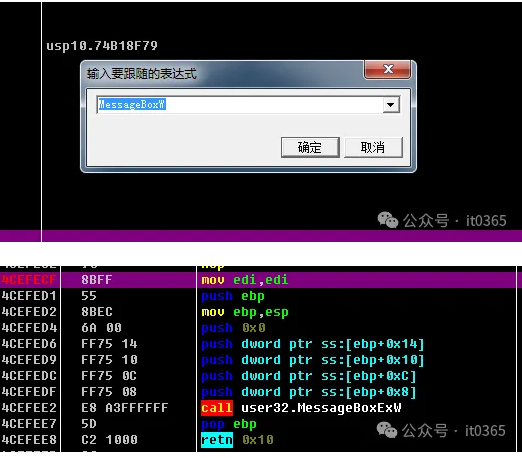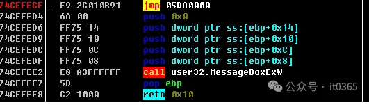 74CEFECF > 8BFF mov edi,edi 74CEFED1 55 push ebp 74CEFED2 8BEC mov ebp,esp 74CEFED4 6A 00 push 0x0 74CEFED6 FF75 14 push dword ptr ss:[ebp+0x14] 74CEFED9 FF75 10 push dword ptr ss:[ebp+0x10] 74CEFEDC FF75 0C push dword ptr ss:[ebp+0xC] 74CEFEDF FF75 08 push dword ptr ss:[ebp+0x8] 74CEFEE2 E8 A3FFFFFF call user32.MessageBoxExW 74CEFEE7 5D pop ebp 74CEFEE8 C2 1000 retn 0x10 此乃正常函數的起始部分。當我們點擊軟件界面上的“HOOK”選項之后,不妨再次進行查看。