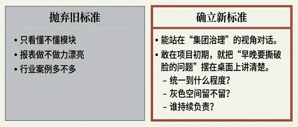 同樣,一個真正成熟的 ERP 項目經理,也不只是會管進度、管里程碑,而是: 敢在項目初期,就把那些“早晚要撕破臉的問題”,擺在桌面上講清楚。 ——集團到底想統一到什么程度; ——哪些灰色空間、特批邏輯,未來要不要繼續存在; ——哪些部門要為這套新規則承擔持續責任。 這些沒談清,后面越“實施”,越是在給舊秩序打補丁。
