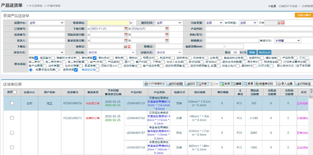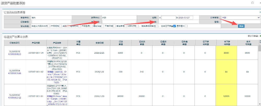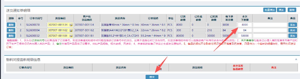 搜索需要出貨的明細 可選擇不同訂單號的物料。選擇之后如下圖所示: ? 提交即可查詢到對應的送貨單;菜單為倉庫管理-物料出庫管理-銷售出庫管理-送貨單明細管理:如下圖所示: