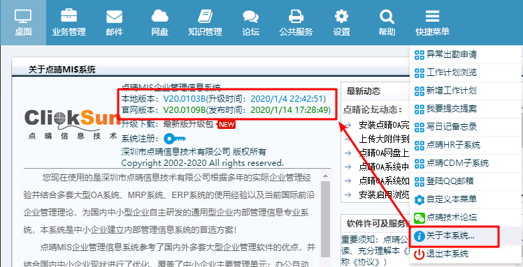 點擊點晴OA快捷菜單-》關于本系統,進入以下界面: