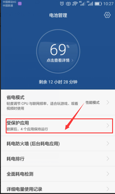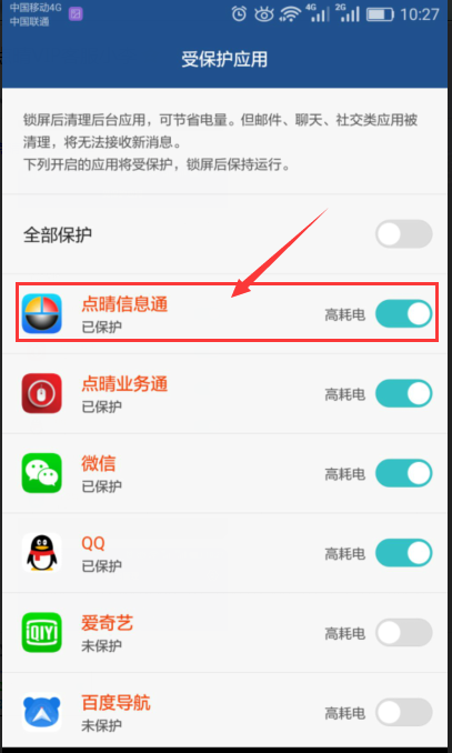 MUI4.0及EMUI4.1:點擊“設置 > 高級設置 > 電池管理 > 受保護應用”,將點晴信息通設置成已保護。