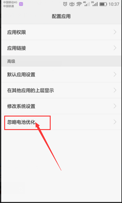 2.2、進入頁面——點擊高級 2.3、進入頁面——選擇“忽略電池優化”2.4、進入頁面后,默認顯示“允許”程序,切換查出所有應用 2.5、找到點晴信息通,設置允許,如下圖所示: QQ%E5%9B%BE%E7%89%8720180123104507.png)