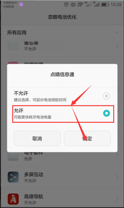 、允許點晴信息通忽略電池優化: