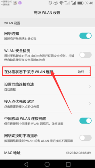 4.1. 點擊“設置 > WLAN > 高級設置 > 在休眠狀態下保持WLAN連接”。