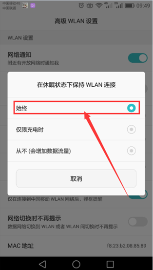 4.1.2、進入后點擊“菜單”——選擇“高級設置”(部分手機可直接點擊“高級設置”)4.1.3、進入菜單點擊“在休眠狀態下保持WLAN”連接,4.1.4、進入菜單后選擇“始終”,如下圖所示:
