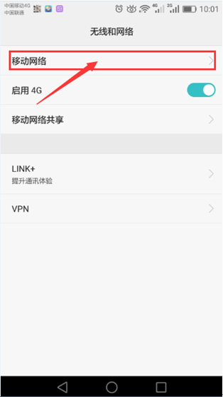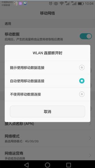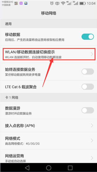 4.2.2、進入菜單后——選擇移動網絡,4.2.3、選擇“WLAN/移動數據連接切換提示”,4.2.4、點擊選擇“自動使用移動數據連接”,如下圖所示:
