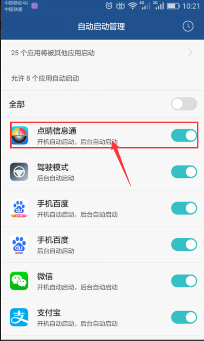點擊“設置 > 權限管理 > 自動啟動管理(開機自動啟動)”,將點晴信息通設置成允許開機自動啟動。