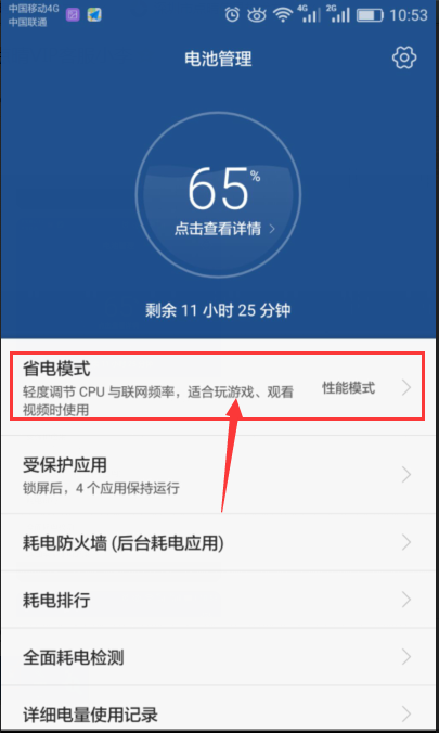 6.1、選擇手機管家,進入頁面 6.2、進入頁面——選擇電池管理 6.3、進入頁面——點擊“省電模式” 6.4、進入頁面——選擇“性能省電或者智能省電”,如下圖所示: