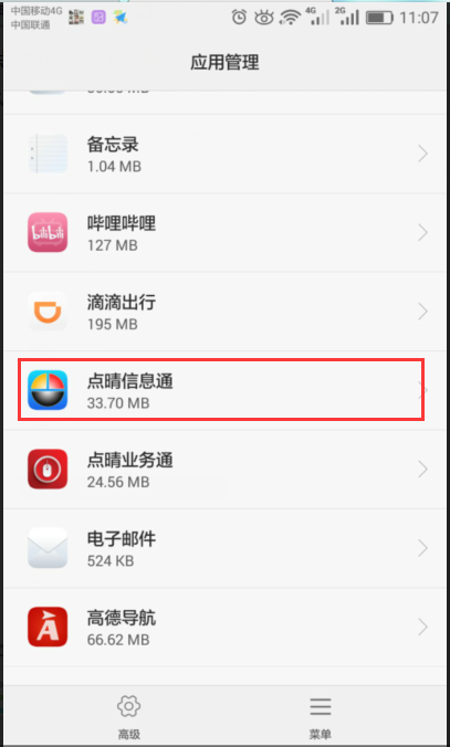 2.2、進入頁面——點擊高級 2.3、進入頁面——選擇“忽略電池優化”2.4、進入頁面后,默認顯示“允許”程序,切換查出所有應用 2.5、找到點晴信息通,設置允許,如下圖所示: