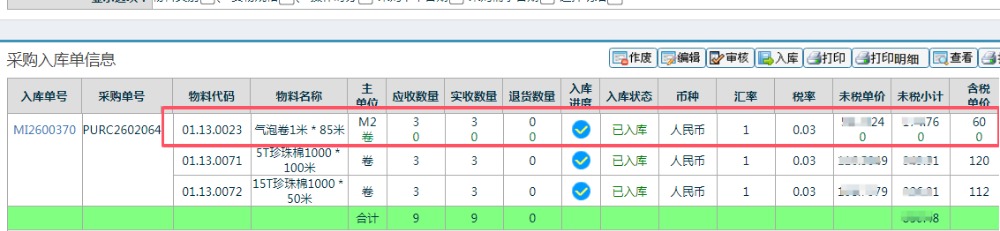 這個物料啟用了多單位采購,可以看到上面按卷采購的單價=0,應該采用按照M2價格進行對賬即可。