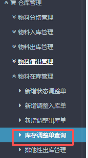 進入ERP系統之后,在左側的功能菜單里找到“倉庫管理”,點開“物料在庫管理”,點擊“庫存調整單查詢”。