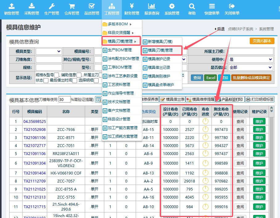 【點(diǎn)晴模切ERP】請(qǐng)問模具壽命統(tǒng)計(jì)在哪里可以查詢到?在工程管理-》模具(刀模)管理-》模具(刀模)管理中,可以看到各個(gè)刀模的使用情況統(tǒng)計(jì):?
