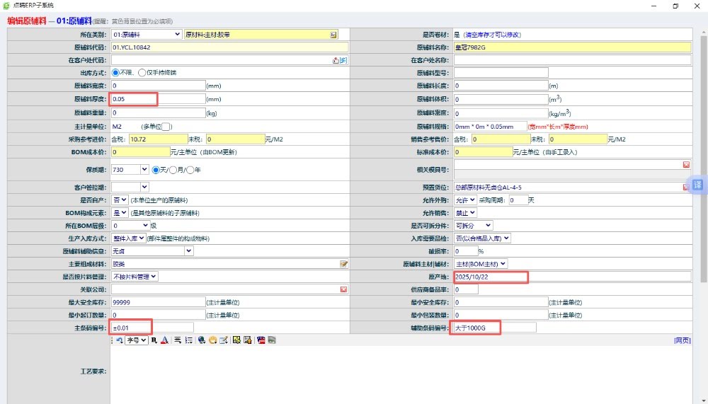 答:針對這個問題可以先在“系統管理”》“物料信息維護”中找到對應物料,然后對物料信息進行編輯,如:物料厚度、主條碼編號和服輔助條編碼進行修改。