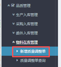 進入ERP系統之后,在左側的功能菜單里找到“品質管理”,點開“物料在庫管理”,點擊“新增質量調整單”。