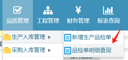 ERP生產(chǎn)品檢報(bào)告在哪查詢操作步驟,如下圖:品質(zhì)管理-品檢單明細(xì)查詢