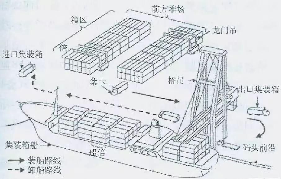 01.碼頭布局集裝箱碼頭最基礎的兩個功能就是將出口重箱輸送出去,將進口空箱運進來。以下是簡化版的裝船路線和卸船路線。基本布局如下,不同數字代表不同的功能區:1.碼頭前沿:設有岸邊集裝箱起重機及其運行軌道。2...