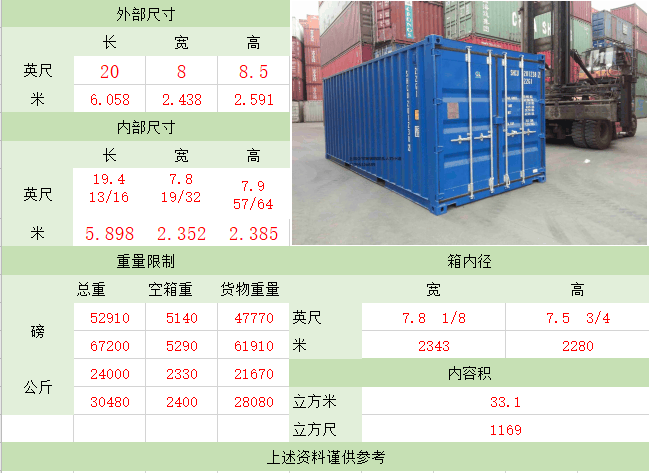 隨著集裝箱運輸的不斷發展,為適應裝載不同種類貨物的需要,因而出現了不同種類的集裝箱。我們平日里常用的基本就是普柜、凍柜、開頂柜、掛式箱、框架箱和罐式箱這幾大類。其余的如牲畜集裝箱、散裝粉狀貨集裝箱、通風集裝箱等特殊類這里暫且不表。常用的柜型尺寸匯總如下圖:1.普通集裝箱普通集裝箱,又稱干貨集裝箱(drycontaine...