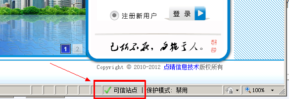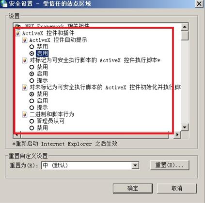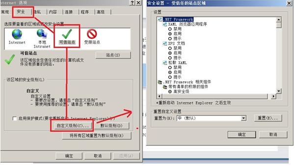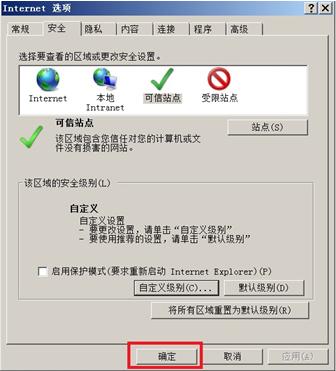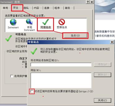 ![]() 處理方法: (1)打開打開點晴MIS系統登陸頁,復制頁面地址: ![]() (2)打開IE [工具]--- [Internet 選項] ![]() 注意:不同版本IE選項的位置可能不同。建議使用微軟IE瀏覽器。 (3)進入[安全]選項 ![]() 操作:依次選擇【安全】---【可信站點】--【站點】。確保“對該區域中所有xxxxx”中的鉤選項為空。 (4)將點晴MIS系統網站添加至可信站點 ![]() 操作:將(1)中復制的頁面地址,粘貼至此處(IE可能會自動跳出地址)點【添加】按鈕后,【關閉】--【確認】上述操作。 注意:如發現列表中已經包含該網站地址,可以使用刪除后重新添加的方式。該列表中出現站點,將對其采取不同設置方式,請確保列表中站點地址是否為合法安全網站。完成這個步驟后,頁面右下角,將變成“可信站點”字樣,如下圖。 ![]() (5)調整IE對于“受信任站點”區域的安全設置 ![]() 操作:重復(2)進入INTERNET選項。依次選擇【安全】【可信站點】【自定義級別】 (6) 配置受信任站點區域安全設置 ![]() 操作:【ACTIVEX 控件和插件】組,建議全部設置為“啟用”或“提示”狀態。【其他】部分,除了“使用彈出窗口阻止程序”以外,也建議全部啟用。 注意:“將文件上載到服務器時包含本地目錄路徑”、“通過域訪問數據資源”和“跨域瀏覽子框架”項,應確認為“啟用”狀態,該選項可能會因為某種原因變更回默認的“禁用”。 ![]() ![]() (7)確定設置改動 ![]() 然后對前面的兩項“Internet”和“本地Intranet”都要點擊“自定義級別…”,重復執行以上的設置,確保“Internet”、“本地Intranet”、“可信站點”三項的配置都開放了以上參數: