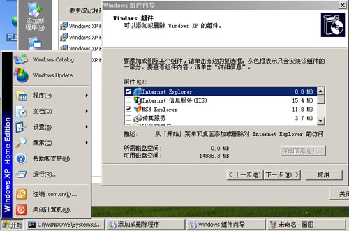 這時,打開你的控制面板,并點擊"添加刪除程序"圖標,之后點擊"添加刪除Windows組件",你應該可以看見圖一的界面。請仔細看,在開始菜單中顯示的操作系統(tǒng)是Windows XP Home,但是經(jīng)過修改,已經(jīng)有了添加IIS的選項了。