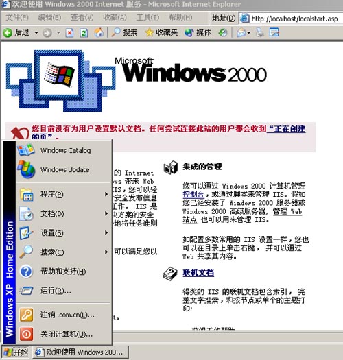 在安裝結束后,你可以打開控制面板-性能和選項-管理工具,"Internet信息服務管理"已經(jīng)出現(xiàn)在那里(圖二)。如果你想要驗證IIS是否運行正常,而已打開IE,在地址欄中輸入"http://localhost"然后回車,如果能看到圖三的界面,那么你的IIS就全部正常運行了。