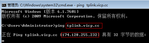 3、DNS解析問題(僅針對域名訪問方式) 可能原因:路由器上已經成功登錄動態域名,該動態域名解析的IP地址不是路由器WAN口IP地址,導致域名無法訪問。 解決辦法:外網用戶確認動態域名解析的IP地址為路由器WAN口IP地址。確認方式:在外網的電腦上ping該動態域名,將返回的IP地址與WAN口IP地址進行對比即可。如下圖: 如IP地址對比不相同,可以嘗試修改外網電腦的DNS服務器地址為8.8.8.8嘗試。