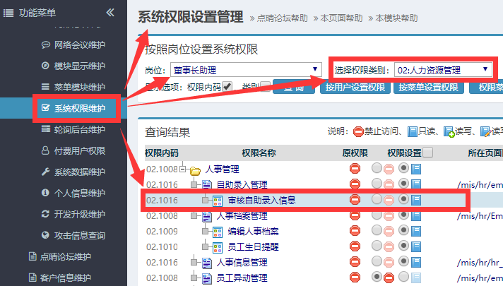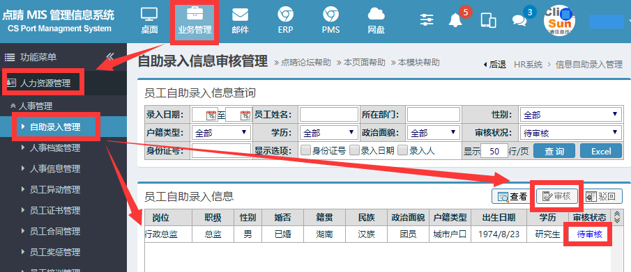 :請問HR自助錄入的信最后發送到人事專員,發送到哪里去了啊?我怎么登陸人事專員的都沒有看到審核消息?![]() 以管理員身份登錄點晴OA,進入系統維護設置-》系統維護管理-》系統權限維護,給人事專員所在崗位開放所有“02:人力資源管理”模塊權限: ![]() 然后人事專員進入OA系統-》業務管理-》人力資源管理模塊,點擊菜單“人力資源管理”,就會看到了審核界面了: ![]() 先點擊需要審核員工所在行,然后點擊審核按鈕,就會進入審核頁面了。