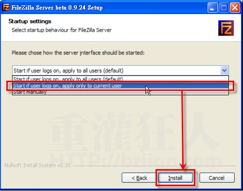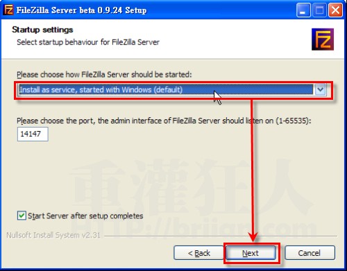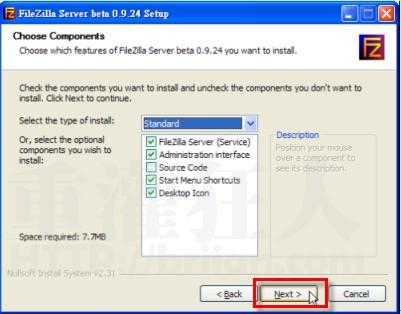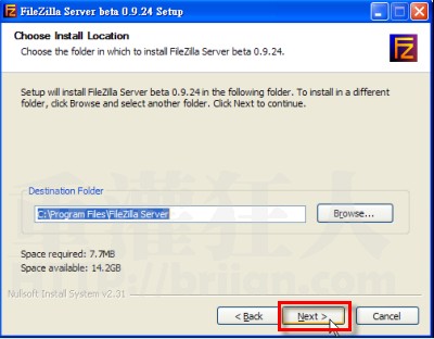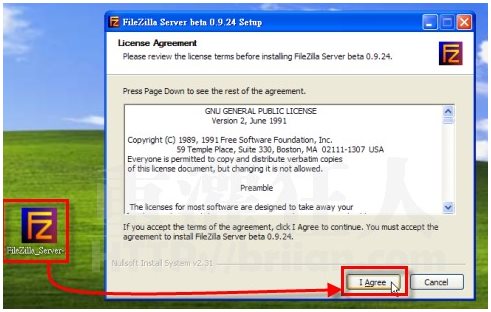 FileZilla Server安裝步驟: FileZilla Server服務器的程序可以看成兩部份,第一部份是FTP的Service服務,也就是提供其他電腦通過FTP通訊協議連接進來存取文件用的網絡服務,這部分的功能可以隨電腦開機自動啟動。而服務器啟動后我們并不會看到程序窗口或圖標,它會在Windows系統的后臺執行,只有在查看「任務管理器」時,才可以看得到。