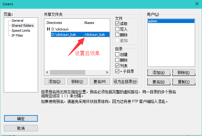 6、在FileZilla Server左側的【頁面】控件樹中點擊【Shared folders】,在【共享文件夾】區域中點擊【添加】按鈕,選擇一個文件夾作為FTP的共享文件夾,然后點擊【設為主目錄】按鈕,將該目錄設置為主目錄。最后點擊窗體下方的【確定】按鈕,完成配置。