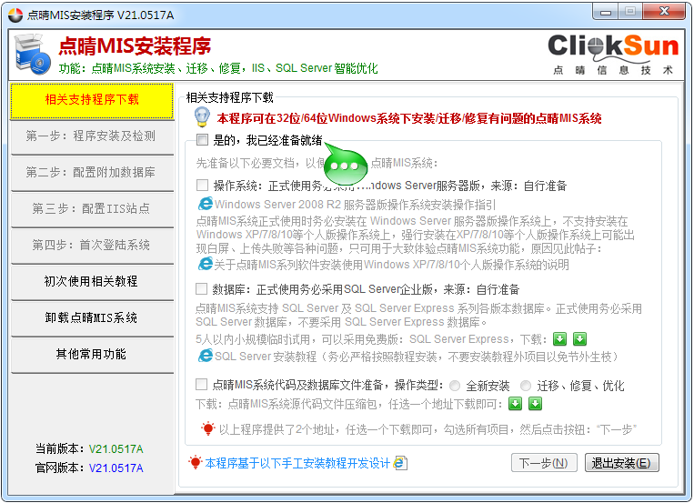 ![]() 下載點晴MIS系統(tǒng)安裝程序(任選一個地址下載即可): 注意: 1、切勿將點晴OA安裝在C盤,一定要安裝在D盤或其他盤。由于Windows系統(tǒng)的C盤是系統(tǒng)盤,整個C盤都有特殊權(quán)限控制,安裝在C盤將導(dǎo)致OA無法正常運行,并且就算設(shè)置調(diào)整后能夠正常運行了,系統(tǒng)中毒或其他原因?qū)е轮匮b系統(tǒng),也會導(dǎo)致OA被徹底破壞!如果采用阿里云/騰訊云/華為云之類的虛擬服務(wù)器,那就必須另外購買數(shù)據(jù)盤,不要直接將點晴OA安裝在系統(tǒng)盤C盤上。如果因為將點晴OA安裝在系統(tǒng)盤C盤導(dǎo)致的異常,請勿詢問如何解決,無法解決! 2、如果OA使用人數(shù)超過10人,應(yīng)該安裝使用SQL Server 企業(yè)版,不要使用免費數(shù)據(jù)庫SQL Server Express版,微軟公司提供的這個Express免費數(shù)據(jù)庫僅用于開發(fā)測試和體驗試用,有諸多限制,可能導(dǎo)致OA使用中頻繁出現(xiàn)瀏覽器頁面白屏之類的多種問題! 3、點晴MIS系統(tǒng)不支持在純局域網(wǎng)內(nèi)安裝和使用,點晴MIS系統(tǒng)安裝和使用過程中都需要連接外網(wǎng),從點晴官網(wǎng)和外部郵局等服務(wù)器上獲取必要的支持性文件及數(shù)據(jù),請確保安裝和使用過程中外網(wǎng)網(wǎng)絡(luò)通暢。如果的確需要僅在純局域網(wǎng)環(huán)境下安裝和使用,不提供免費技術(shù)支持,請聯(lián)系點晴公司在線客服咨詢?nèi)绾翁峁└顿M服務(wù); 4、Windows電腦上如果安裝了Windows Defender、360安全衛(wèi)士、QQ安全管家之類的安全軟件,則務(wù)必徹底暫停這類安全軟件的運行,否則可能導(dǎo)致安裝過程異常! 5、點晴MIS系列管理信息系統(tǒng)安裝時常見問題匯總: 點晴MIS系統(tǒng)安裝視頻教程: Windows Server 2008/2012/2016/2019 服務(wù)器版上安裝視頻教程 如果暫時沒有Windows Server服務(wù)器環(huán)境,只是想初步了解和簡單體驗一下點晴OA系統(tǒng),也可以在Windows XP/7/8/10/11個人版操作系統(tǒng)上安裝測試體驗系統(tǒng): Windows 7/8/10 個人版操作系統(tǒng)上安裝視頻教程 Windows 11 個人版操作系統(tǒng)上安裝視頻教程 如果在Windows XP/7/8/10/11個人版操作系統(tǒng)上安裝點晴OA測試體驗系統(tǒng)遇到問題無法繼續(xù)時,請勿詢問如何解決(原因說明:http://3992.oa22.cn),請立即準備一臺電腦安裝Windows Server簡體中文服務(wù)器版操作系統(tǒng)后,再安裝點晴OA系統(tǒng),一定可以!